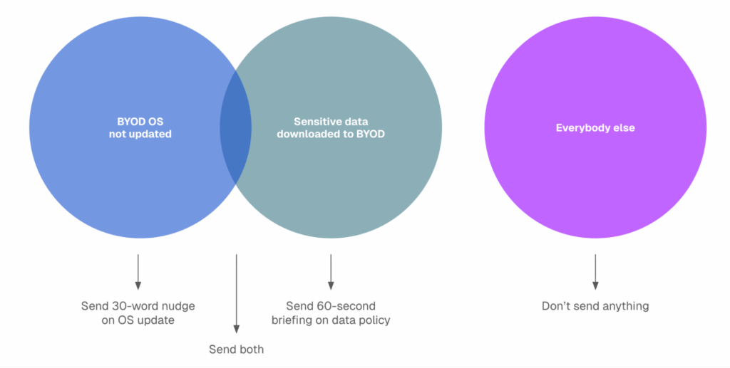 Your path forward on safe BYOD use includes modern human risk management. Your human risk platform should understand your areas of risk and policy non-compliance and deploy super-relevant, just-in-time interventions to help employees course-correct without blocking them from using their devices.