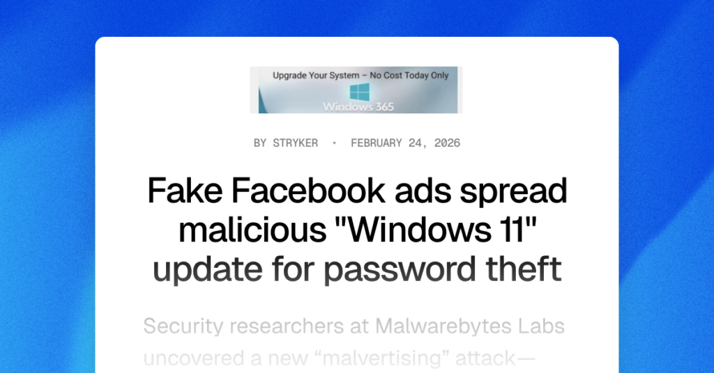 Facebook ads promote a fake free Windows 11 update that steals passwords, session tokens, and crypto. See how these malvertising lures work.
