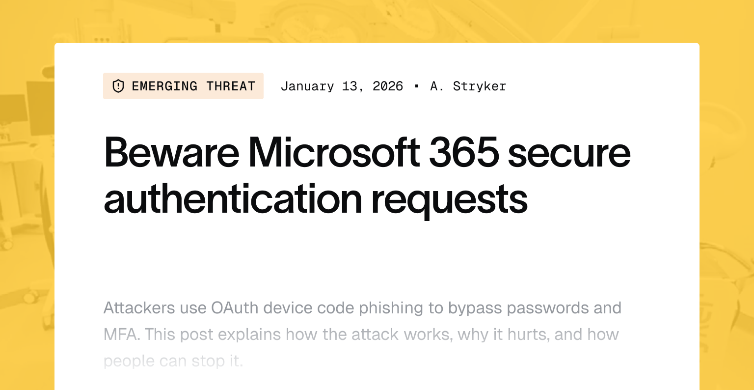 November 2025: Cloud security researchers see more OAuth device code bypass attempts in their own security product across their customer base–with 98 suspicious successful authentication attempts, six malicious device registrations, and 7 Windows registration after device code authentications in the last three months. (Wiz)